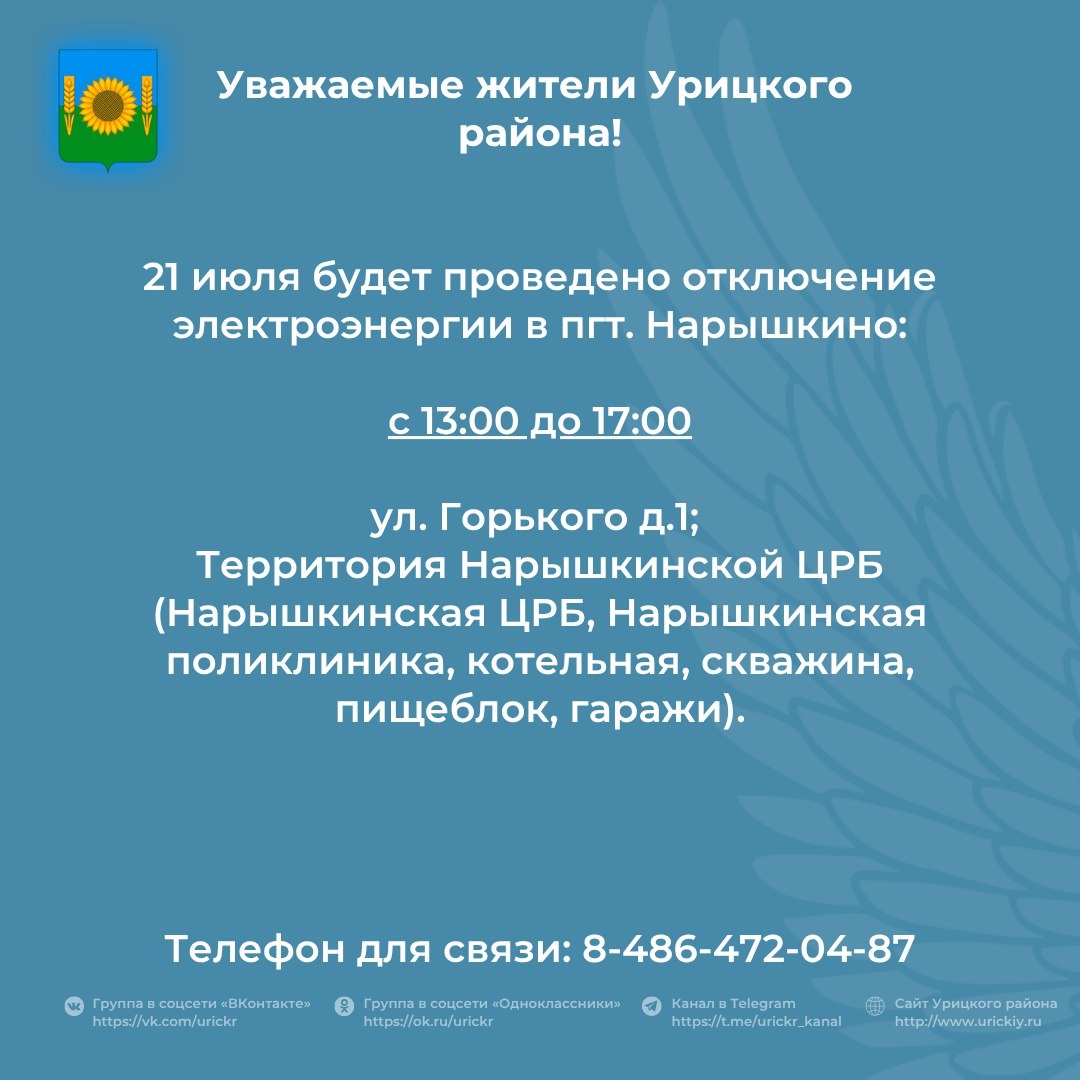 Уважаемые жители Урицкого района! 📢 21 июля будет проведено плановое отключение электроэнергии в поселке Нарышкино. Все подробности в карточке ⬆️ #УрицкийРайон #АдминистрацияУрицкогорайонаОрловскойобласти