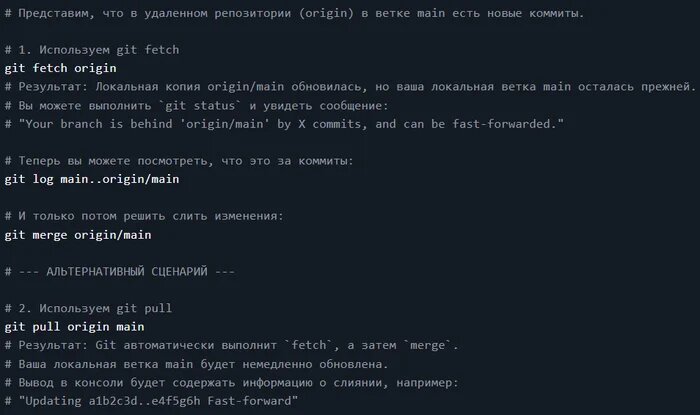 Хотя обе команды используются для синхронизации с удаленным репозиторием, они работают по-разному. Понимание этой разницы критически важно для предсказуемой и безопасной работы с Git.