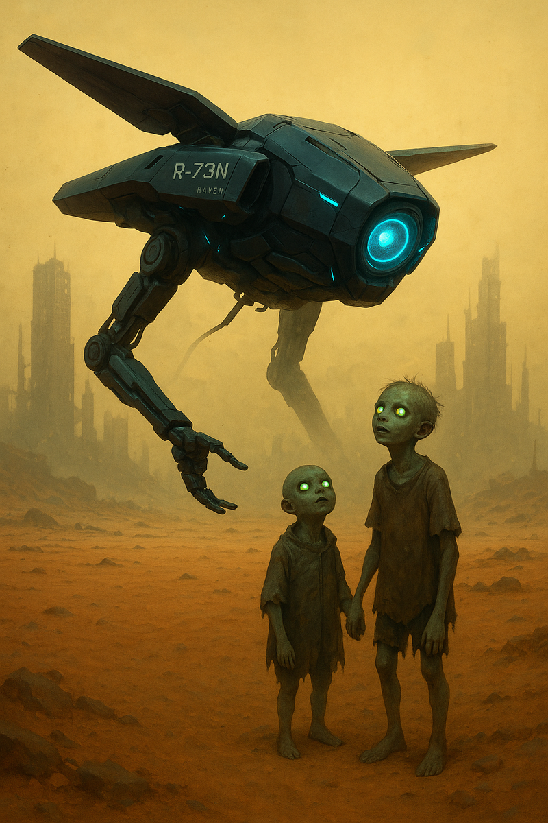 Бета подтащила его к стене, ткнув пальцем в рисунок "Ворона", затем – в его корпус. Альфа протянул обугленную палку. Директива кричала: ОТКАЗ! КОНТАМИНАЦИЯ! Но в ядре R-73N что-то перемкнуло. Его манипулятор плавно принял палку. Тонкие сервоприводы, созданные для ремонта наночипов, с непривычной осторожностью сомкнулись на грубом угле. Он поднес его к стене рядом с детским рисунком.