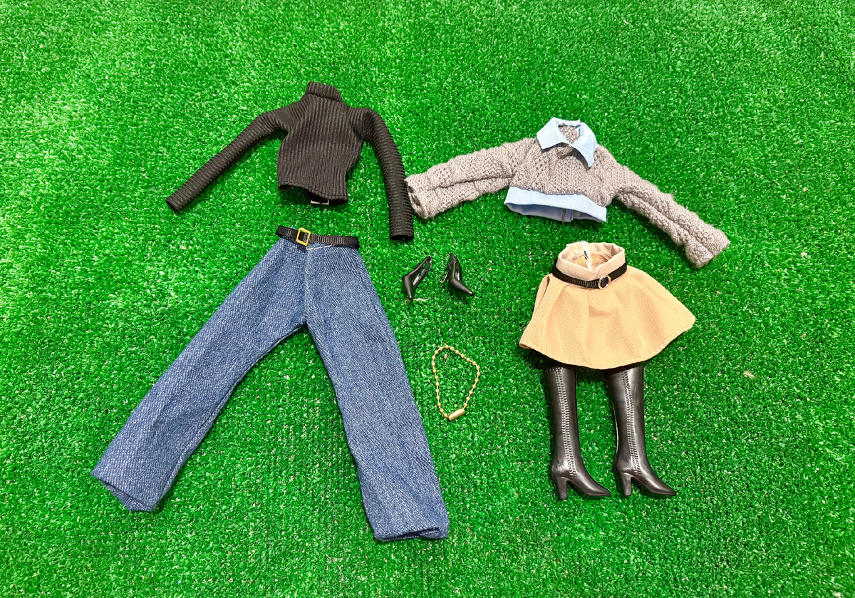Еще до куклодиеты я купила для Нины комплект одежды, который состоял из брюк, юбки, двух кофт и двух пар обуви. Плюс ко всему этому шла цепочка. Мне показалось интересным, что эти вещи можно по-разному комбинировать и получился целых четыре костюма. Изначально предлагалось носить юбку с серой вязаной кофтой, а джинсы - с черной водолазкой. Но я решила сделать все наоборот. Сначала примерили джинсы с кофтой: Вроде, неплохо, но брюки были длинноваты, она ведь петит, но я-то знаю, что делать в таких случаях (сама все время с этим сталкиваюсь), и мы их просто подвернули. А уже потом пошли в ход юбка с водолазкой: В этом комплекте мне потравилось тоже все, кроме длины (и все-то мне не угодишь с длиной 🤣). Юбка оказалась невысокой Нине прям только-только. Думаю, что на более высокой Барби будет вообще экстремально коротко. Но тут уж, как говорится, куклы сраму не имут 🤷🏻♀️ Но Нина как будто даже иногда придерживала юбочку Затем примерили так, как советовал продавец: Тоже ничего та