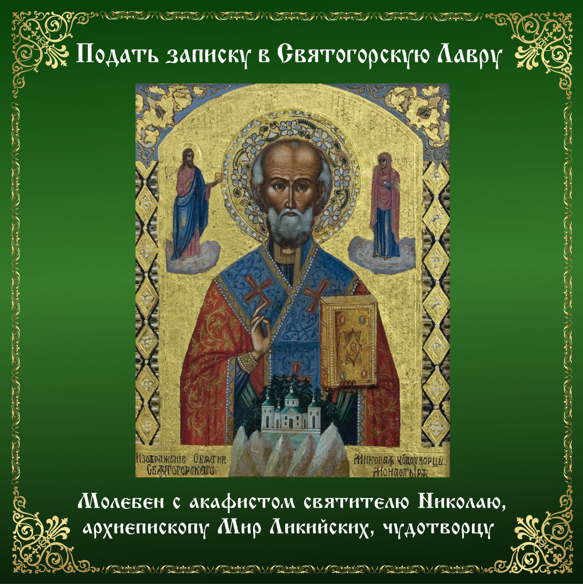 Святитель Николай жил в конце III – начале IV века. Нас отделяет от него почти 1700 лет, и в течение всех этих веков его память бережно сохраняется в Церкви, потому что он прожил удивительную жизнь, стяжав огромную силу духа, и горячей верой своей приблизился к Богу настолько, что Бог даровал ему особую силу – силу совершать чудеса. В Святогорской Лавре ежедневно в 14:00 служится молебен с акафистом святителю Николаю Чудотворцу в его храме на Святой Скале (в тёплое время года) или в пещерном Антоние-Феодосиевском храме (зимой), а также каждый вторник утром после полунощницы — соборный молебен святителю Николаю в Успенском соборе. Записки на молебен о здравии принимаются ежедневно на одну службу. При подаче записок необходимо написать записку с именами, указать, на какую службу подаётся записка и информацию из чека: дату, сумму пожертвования и название системы, с помощью которой был осуществлён перевод. Каждое имя пишется в родительном падеже с новой строки. Пишутся только имена, данные