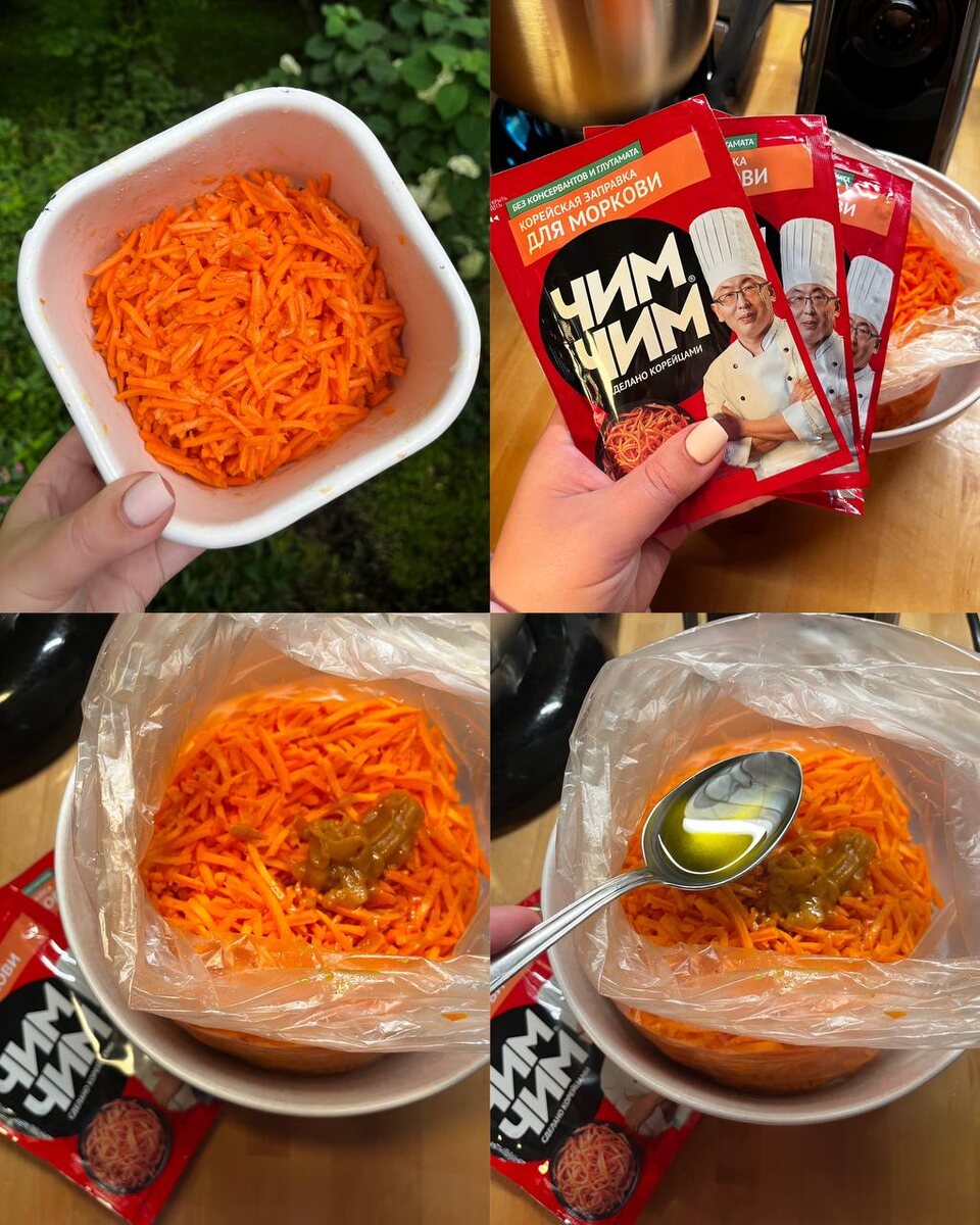 Около недели назад я наконец-то купила себе мясорубку с насадками, в том числе тёрку и тёрку для корейской морковки. Для человека, который любит готовить, но не любит нарезать и тереть — это прям счастье. Первым делом протестировала тёрку для корейской морковки — нарезает идеально. Решила сразу попробовать два варианта морковки по-корейски: • 4 крупные морковки • 1 ч. л. куркумы • 1 ч. л. сахара • 1 ч. л. соли • 1 ст. л. уксуса • 1 ст. л. дижонской горчицы • 1 ст. л. французской горчицы • 8–10 ст. л. масла (по рецепту — растительное, у меня было оливковое) Использовала готовую смесь из пакетика для корейской морковки (покупала на Ozon (https://www.ozon.ru/product/koreyskaya-zapravka-dlya-morkovi-chim-chim-3-sht-po-60-gr-1785181504/)). Просто добавила масло — получилось быстро и вкусно. Итог: обе версии получились классными. С пакетиком — удобно, с домашними специями — интереснее по вкусу. Если любите морковку по-корейски — рекомендую попробовать оба варианта. ❤️ ❤️ ❤️ Забирай подборку