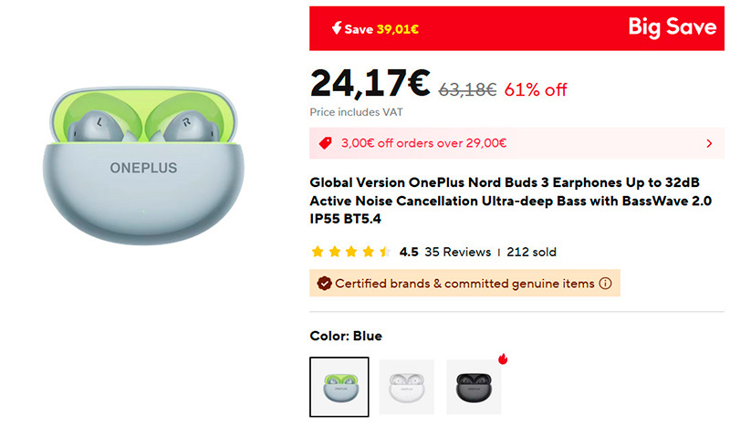 Совсем недорогие TWS-наушники OnePlus Nord Buds 3. За 24 евро - поддержка кодеков SBC и AAC, активный шумодав, режим прозрачности, Bluetooth 5.4, защита IP55, расширенный бас. С шумодавом от одного заряда работает 8 часов (28 часов с подзарядкой из кейса), без шумодава - 12 часов (43 часа с подзарядкой). 10 минут зарядки разряженных наушников хватит на 4 часа работы. Три варианта цветов.