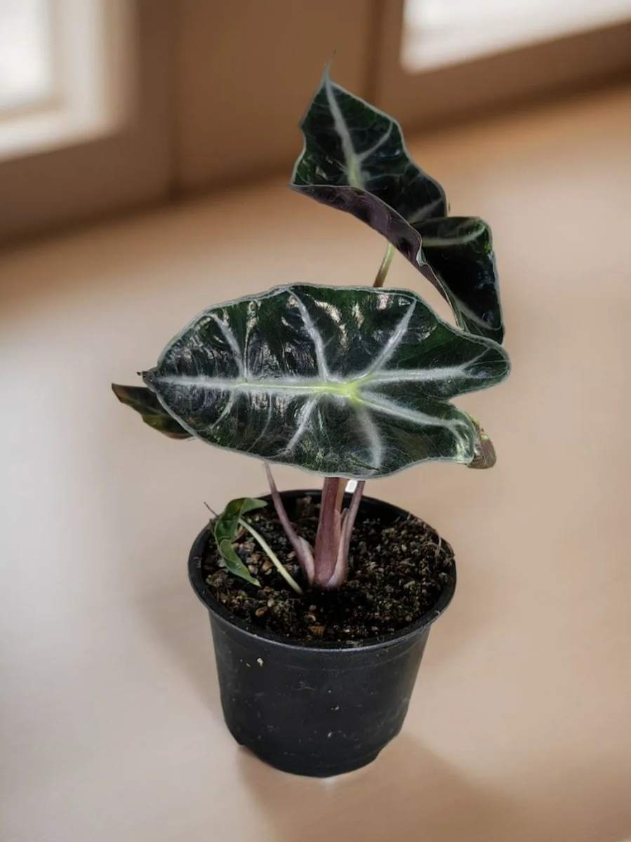 Первые места у меня занимали самые популярные нынче растения Хойи и Алоказии. Кстати, Алоказии дважды пытались проникнуть ко мне в виде клубней. Один приехал с новогодним подарком, но, видимо, замерз в посылке и мои усилия по проращиванию закончились ничем. А второй мне положили в подарок с покупкой растений уже весной. У него проросли корешки, листьев еще не было и мне удалось пристроить его в хорошие руки. Итак, я надеялась, что избавилась от Алоказий и у меня они не появятся. Но не тут-то было))))) В нашу пятерку привезли Алоказии Полли)))) А Полли, пожалуй, была единственной, которая мне визуально нравилась. Правда, я вообще не знаток Алоказий, хотя вот на сегодняшний день видела их не мало и в совместных закупках и у блогеров. Но это все же в основном не мое растение. Но про Полли)) Вот такой я ее принесла из Пятерочки.