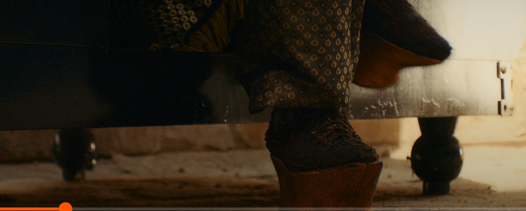 По следам вчерашней серии сделаю краткую заметку об очень яркой детали. В сцене, когда Енниоль посещает Альдо в Агарисе и выходит из паланкина, нам крупным планом показывают его обувь: А затем слуги открывают для него зонтик: Не знаю, имели ли ввиду то же самое постановщики, но у меня вот какие ассоциации. В "Исторических корнях волшебной сказки" В.Я. Пропп со ссылкой на Фрэзера рассказывает о царях и верховных жрецах в древнем мире [Глава II, 3. Фрэзер об изоляции царей]: Каждое движение их регламентировалось целым кодексом, чрезвычайно тяжким для исполнения. Одним из правил этого кодекса было — никогда не покидать дворца. <...> [также существовали] некоторые другие окружавшие царя запреты <...> царь не должен показывать своего лица солнцу, поэтому он находится в постоянной темноте. Далее, он не должен касаться земли. Таким образом, вот эта на первый взгляд забавная атрибутика главы общины гоганов Енниоля - зонтик и высокая платформа на обуви - имеет очень древнюю историческую символи
