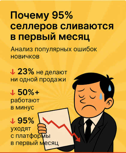 🔻 95% — уходят с платформы в первый месяц То есть в «выживших» остаётся всего 5% — каждый двадцатый. Маркетплейсы кажутся простыми: «завёл аккаунт — и поехали».
