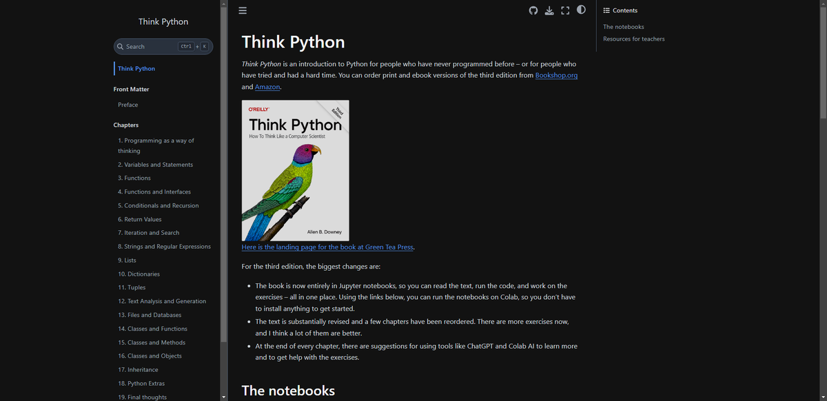 ThinkPython — это подробный курс по программированию на языке Python, оформленный в виде Jupyter Notebook, который позволяет освоить язык с полного нуля и достичь уверенного уровня junior‑разработчика всего за три месяца. Репозиторий основан на третьем издании книги Аллена Дауни — известного профессора и автора обучающих материалов по программированию. * Чётко структурированный материал: Курс охватывает ключевые темы — от основ синтаксиса, переменных и функций до работы со строками, списками, словарями, циклами, условиями, модулями и файловыми операциями. Особое внимание уделено объектно-ориентированному программированию и тестированию. * Интерактивное обучение: Весь материал представлен в формате Jupyter Notebook. Это позволяет не только читать теорию, но и сразу запускать, редактировать и анализировать код. * Поддержка Google Colab: Курс можно проходить онлайн без необходимости установки Python на компьютер. * Обновлённое содержание: Третье издание адаптировано под современные версии