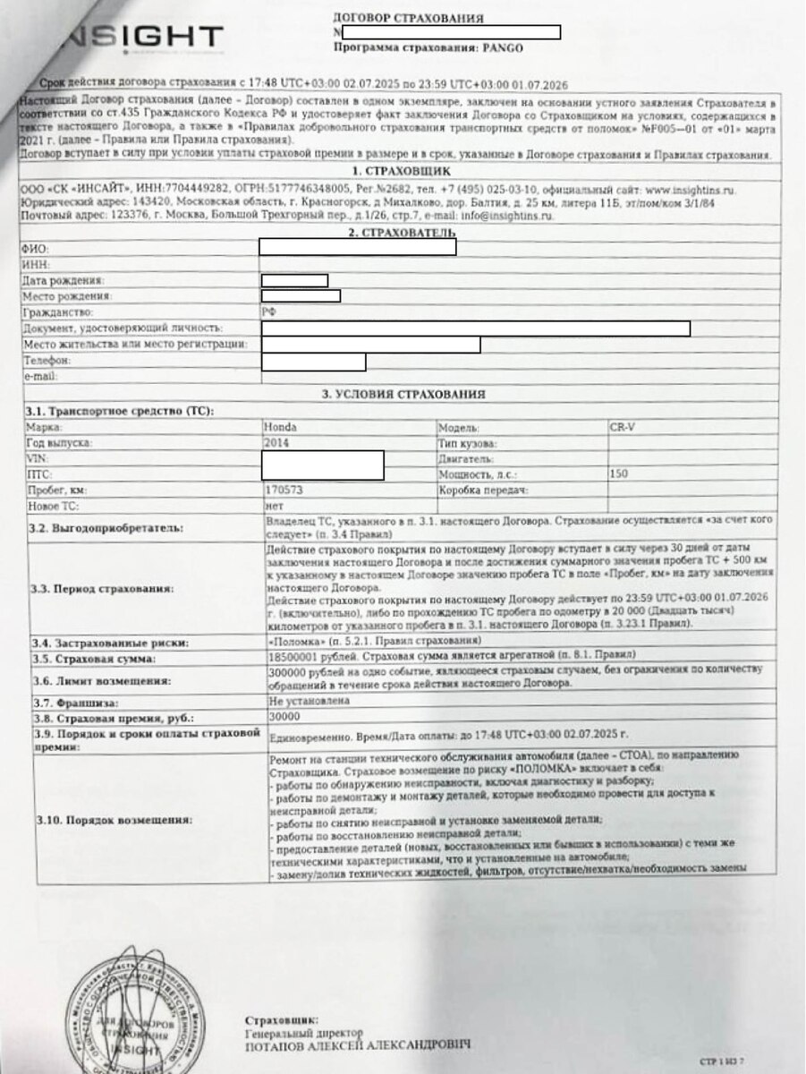 1. Для возврата денежных средств необходимо направить на юридический адрес ООО «СК «Инсайт» мотивированную досудебную претензию Почтой России, в которой следует требовать расторжения договора и вернуть денежные средства в полном объеме.