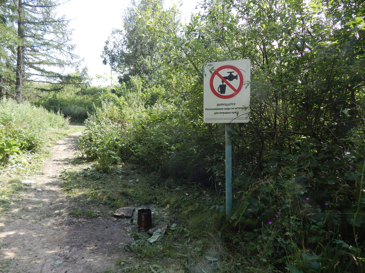 Ладно, на фото выше я уже вошёл в Пироговский лесопарк и движусь вдоль русла реки. Фото - вид назад. Я заприметил странную ржавую трубу, торчащую из земли. Из неё вытекает вода. Есть рядом табличка, предупреждающая, что употреблять внутрь сиё питьё возбраняется. В самой трубе вполне себе видно дно. Вода бьёт из "ниоткуда" с приличным напором. Прямо "гейзер", хотя, конечно, жители Камчатки закидают меня камнями за такое заявление.
