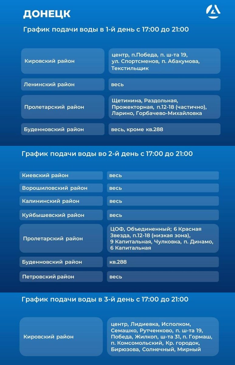 С 21 июля график в Донецке и Макеевке воду будут подавать раз в три дня с 17:00 до 21:00 – с разбивкой по районам: График подачи в Донецк Иллюстрация: «Вода Донбасса» График подачи в Макеевку Иллюстрация: «Вода Донбасса»