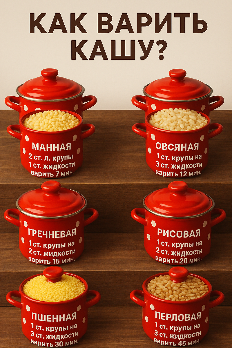 Гречка, пшёнка, манка, овсянка — каждый из нас хоть раз задавался вопросом: "Сколько воды нужно?" и "Сколько варить?" Чтобы не гадать каждый раз, мы собрали в одном посте наглядную и удобную подсказку: шесть популярных каш, пропорции крупы и жидкости, время приготовления — всё чётко и понятно. Сохраните себе, чтобы не забыть. Подходит как для начинающих, так и для опытных кулинаров. А теперь к вам вопрос: Какая ваша любимая каша и как вы её готовите? Может, у вас есть свои секреты или нестандартные рецепты? Пишите в комментариях — обсудим.
