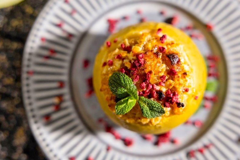 • Сублимированные ягоды – для декора 1. В миске соедините яйцо и тростниковый сахар. Взбейте венчиком до однородной массы. Добавьте ванилин, корицу, творог и снова хорошо перемешайте. 2. Курагу заранее промойте и обсушите. Нарежьте мелким кубиком. Вмешайте вместе с изюмом в творожно-яичную смесь. 3. У яблок удалите верхнюю часть с плодоножкой. Извлеките сердцевину и часть мякоти внутри. 4. За