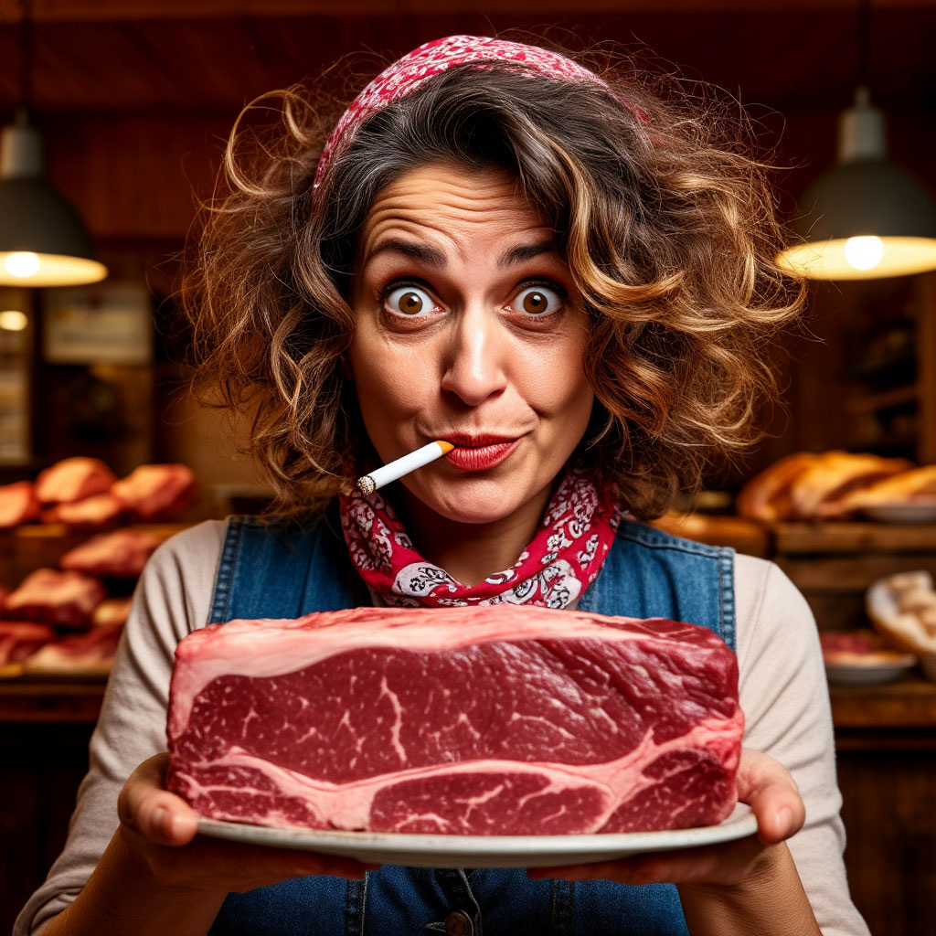 И тут я, как настоящая актриса, выхожу на сцену! 🎭 Говорю продавщице (а она, кстати, была дамой с выразительными глазами, которые сейчас закатывались в самый верх): "Милая моя, - говорю я ей голосом, полным трагизма и возмущения, - вы меня, конечно, извините, но это не свежее мясо, а какой-то музейный экспонат! Динозавры его уже, наверное, погрызли!" 😠