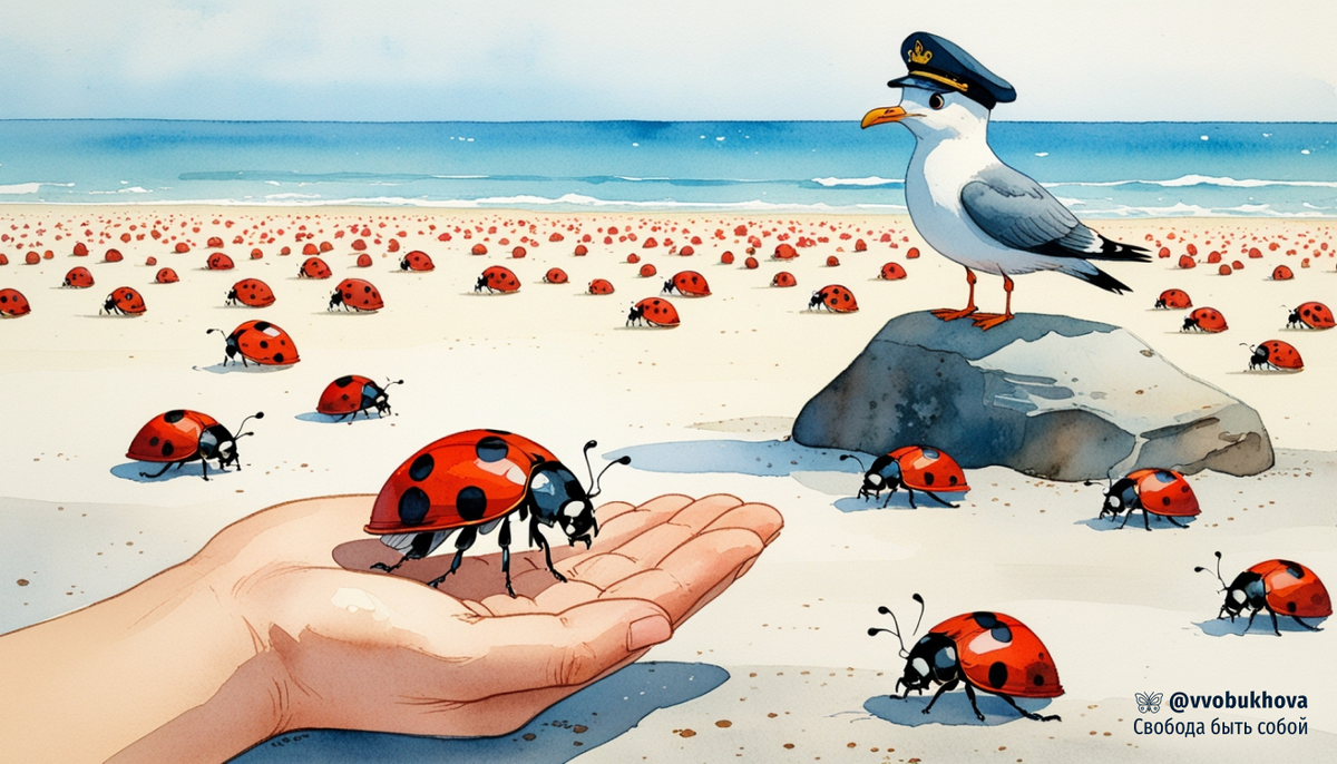 Вернулась на своё место на песке и стала наблюдать. Заметила, что божьи коровки не просто сидели. Они двигались в одном ритме, как хорошо отрепетированный оркестр. Все — в одном направлении, медленно, при этом верно, переползали по камням и травинкам, словно ручейки, которые стекались к морю. И останавливались у самой кромки воды, будто пассажиры перед посадкой. Будто чего-то ждали.
