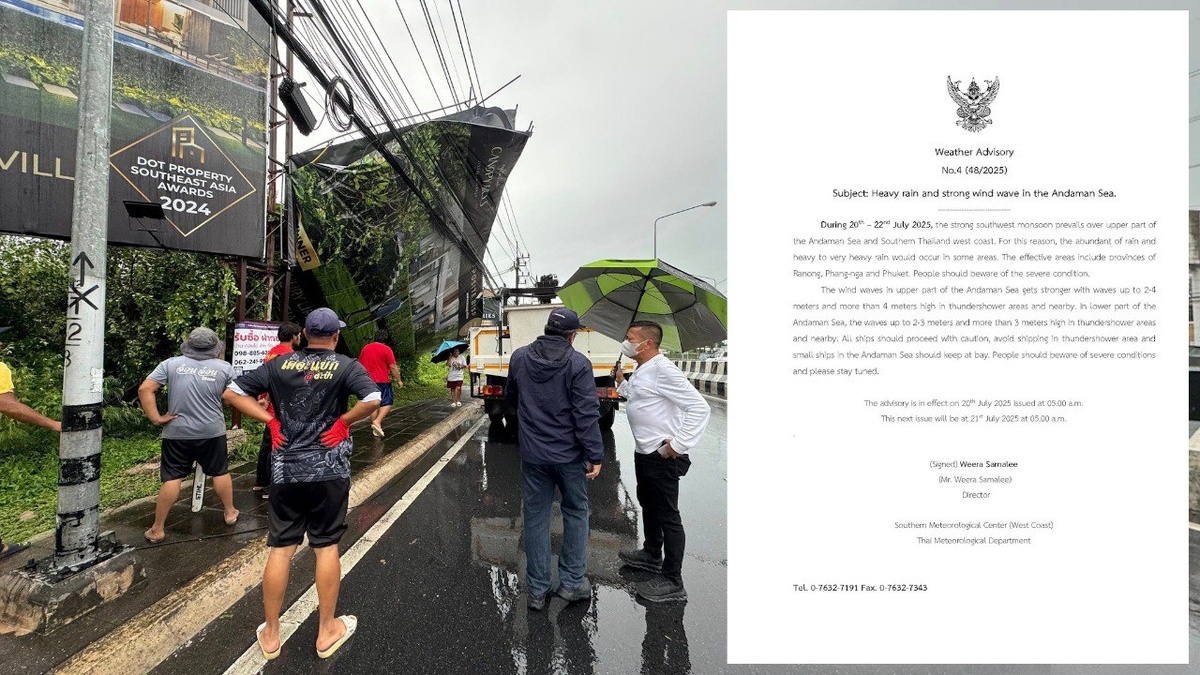 Синоптики ждут продолжения штормов на Пхукете Муниципалитеты и административные организации районов ликвидируют последствия воскресного (20 июля) шторма на Пхукете и готовятся к продолжению непогоды на протяжении еще двух дней. Метеорологическое предупреждение Phuket Met остается в силе вплоть до 22 июля. Пхукет принял первый удар стихии на день позже, чем прогнозировали изначально синоптики. Штормовое предупреждение было объявлено с 19 июля, но по-настоящему мощный шквал обрушился на остров после полудня 20 числа. По состоянию на 18:00 муниципалитеты продолжали убирать с дорог поваленные деревья и рекламные биллборды, а Управление энергоснабжения провинций (РЕА) восстанавливало линии электропередач там, где они были повреждены. О пострадавших в результате шторма не сообщалось. Спасатели административной организации провинции Пхукет (РРАО) провели в районе полудня отдельную операцию, эвакуировав с острова Рача-Яй туристку, у которой возникли проблемы со здоровьем. РРАО не сообщила,