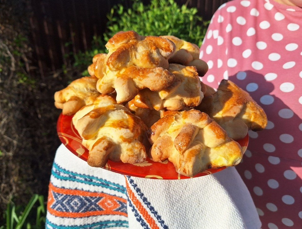 Далее необходимо застелить пергаментной бумагой противень и разложить на него сформированные шишки-булочки. Нужно дать им время, чтобы они немного подросли (примерно 10-15 минут). После их увеличения берём желток куриного яйца и смазываем каждую из них.