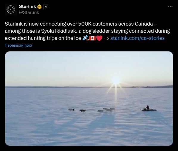 SpaceX - Starlink у себя на странице в X: "На данный момент Starlink соединяет более 500 тысяч Клиентов по всей Канаде. Связь даже в собачьей повозке во время поездок по льду 🛰️🇨🇦❤️"