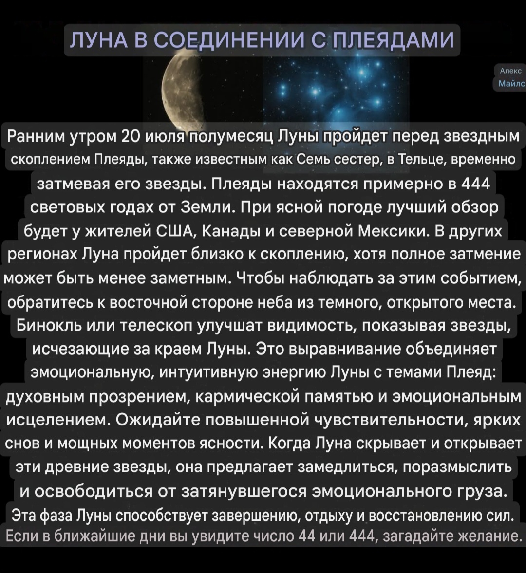 В астрологии Плеяды связаны с интуицией, внутренним видением и эмоциональной трансформацией. Их появление рассматривается как знак замедления, размышления и воссоединения со своим внутренним «я». Когда Луна проходит над Плеядами, как это произойдёт 20 июля, она может ощущаться как завеса, на короткое время скрывающая высшую мудрость — сигнал к отдыху, освобождению и прислушиванию к своему внутреннему миру.