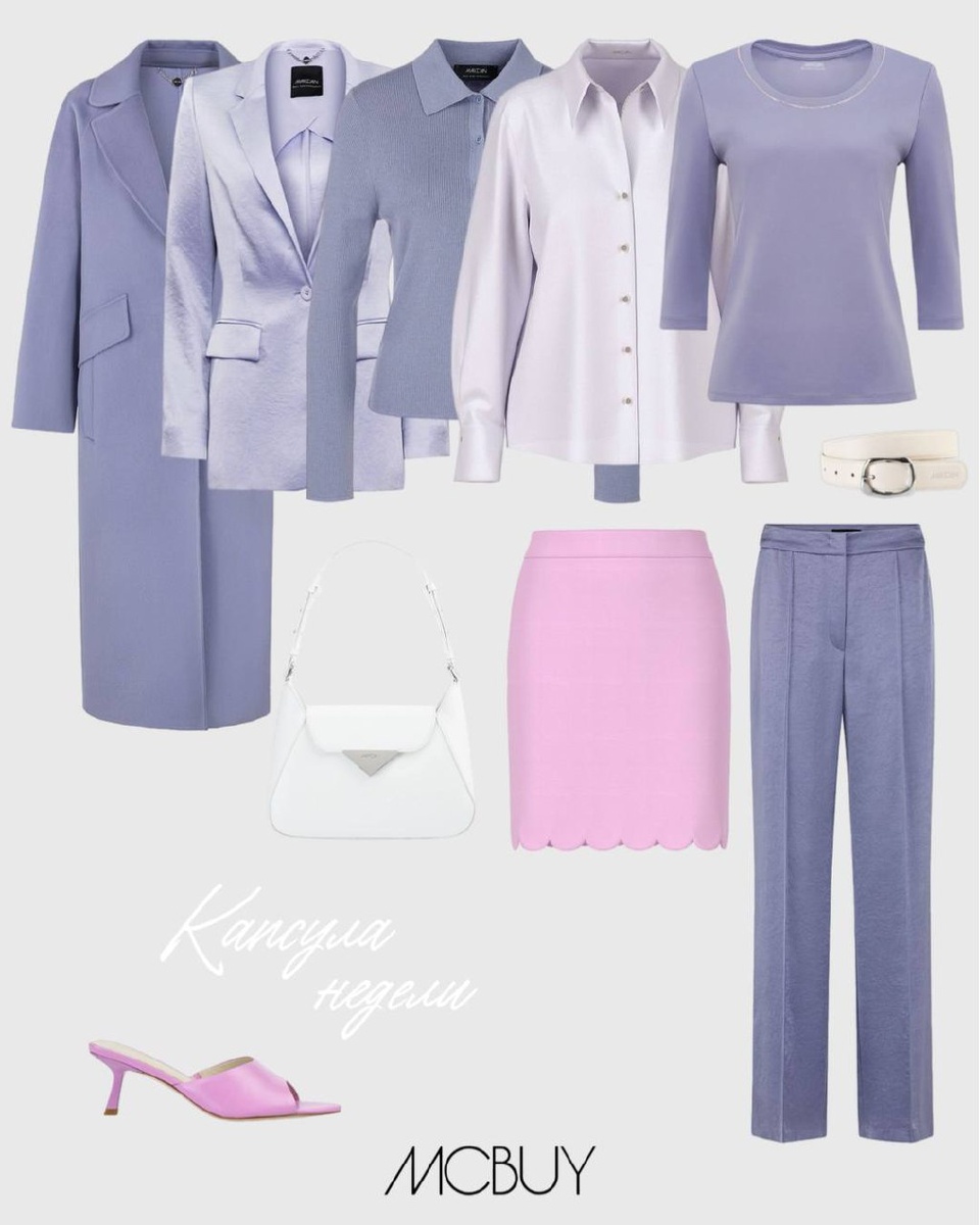 Капсула недели 💜 Выполнена в нежных пастельных оттенках сирени и лаванды. Чёткие линии пальто и брюк сочетаются с мягкими фактурами рубашек и топов. Акцент — сиреневая юбка с узорчатым подолом и мюли в тон. Белые аксессуары добавляют свежести. Ссылки на товары: - однобортное пальто; - однобортный пиджак; - блуза из шёлка; - пуловер из хлопка; - кардиган из шерсти; - юбка с узорчатым подолом; - брюки со стрелками; - сумка с логотипом; - ремень из кожи; - мюли из кожи Капсула сочетается между собой и подойдёт как для офиса, так и для прогулок. Товары доступны на сайте mcbuy.ru и в бутиках в Москве и Санкт-Петербурге.
