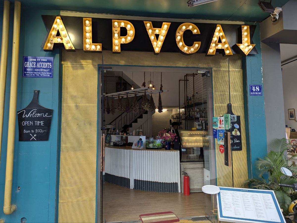 Альпака. Нячанг. Вьетнам. 05.07.2025 Вернулись в Нячанг ещё до темноты. Дети проголодались. Неожиданно для себя обнаружили во Вьетнаме такую особенность: отсутствие вкусных десертов. Обычных пирожных или тортиков. Десертов в нашем привычном понимании. Они есть в меню, но на вкус отвратительные. Как сами коржи, так и пропитка. Вкус искусственного крема из баллончиков. Попытки замаскировать это все кусочками фруктов не улучшают вкус. Как узнали позже, там беда с молочкой. Ближайшие коровы есть в Далате, в горах, и насколько я поняла, они больше мясные, чем молочные. Оттого есть нехватка сливок, масла, сметаны. Хотя молоко продаётся в супермаркетах, в тетрапаках В кофе не добавляют сливки или молоко, добавляют сгущёнку. Либо делают на альтернативном молоке. Так вот, почитала я по отзывам, в этом самом кафе Альпака, говорят, что есть неплохие десерты, по сравнению со всем побережьем. А ещё там есть официант, который учит русский и отрабатывает на посетителях. А десерты там немного