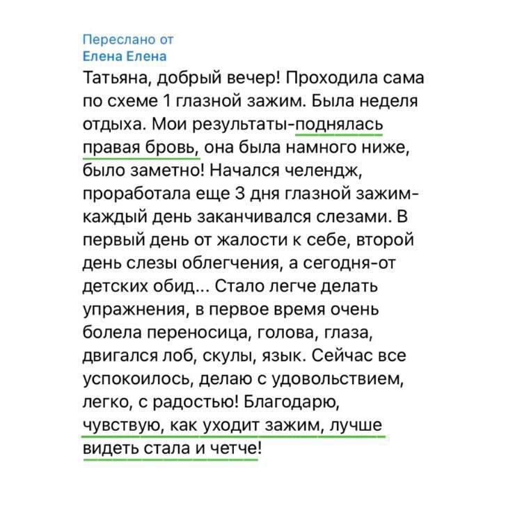 Но стоит начать работать с зажимом — и буквально через пару занятий появляются комментарии: “Вижу чётче, глаза меньше устают, головная боль проходит”. У кого-то уходит привычка всё время щуриться, а кто-то впервые за долгое время может обойтись без очков хотя бы дома.