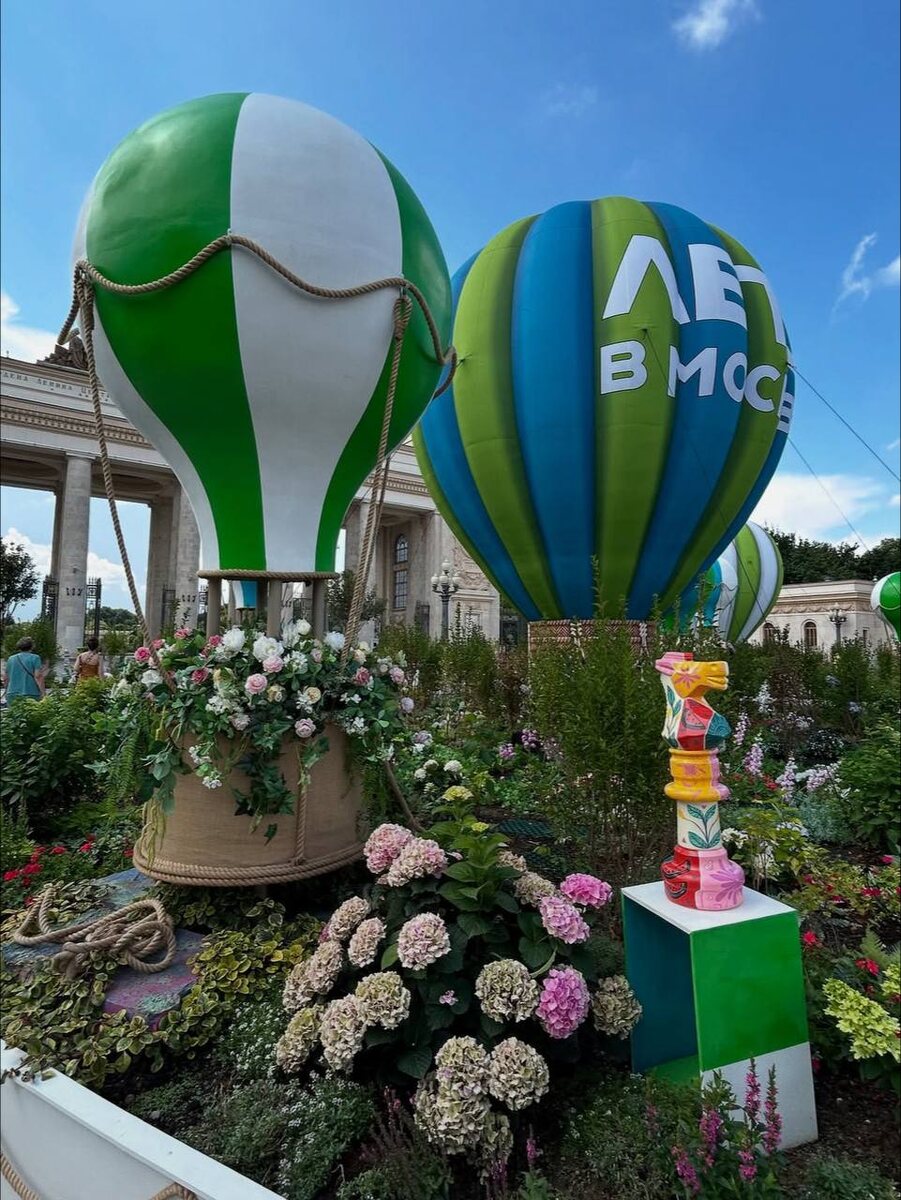 Для тех, кто в эти выходные не поехал в Переславль-Залесский — отличная альтернатива в городе: гигантские воздушные шары парят над цветочным морем прямо перед Аркой главного входа. Шахматы, зеркала для фото, зоны отдыха и более 10 000 живых растений.