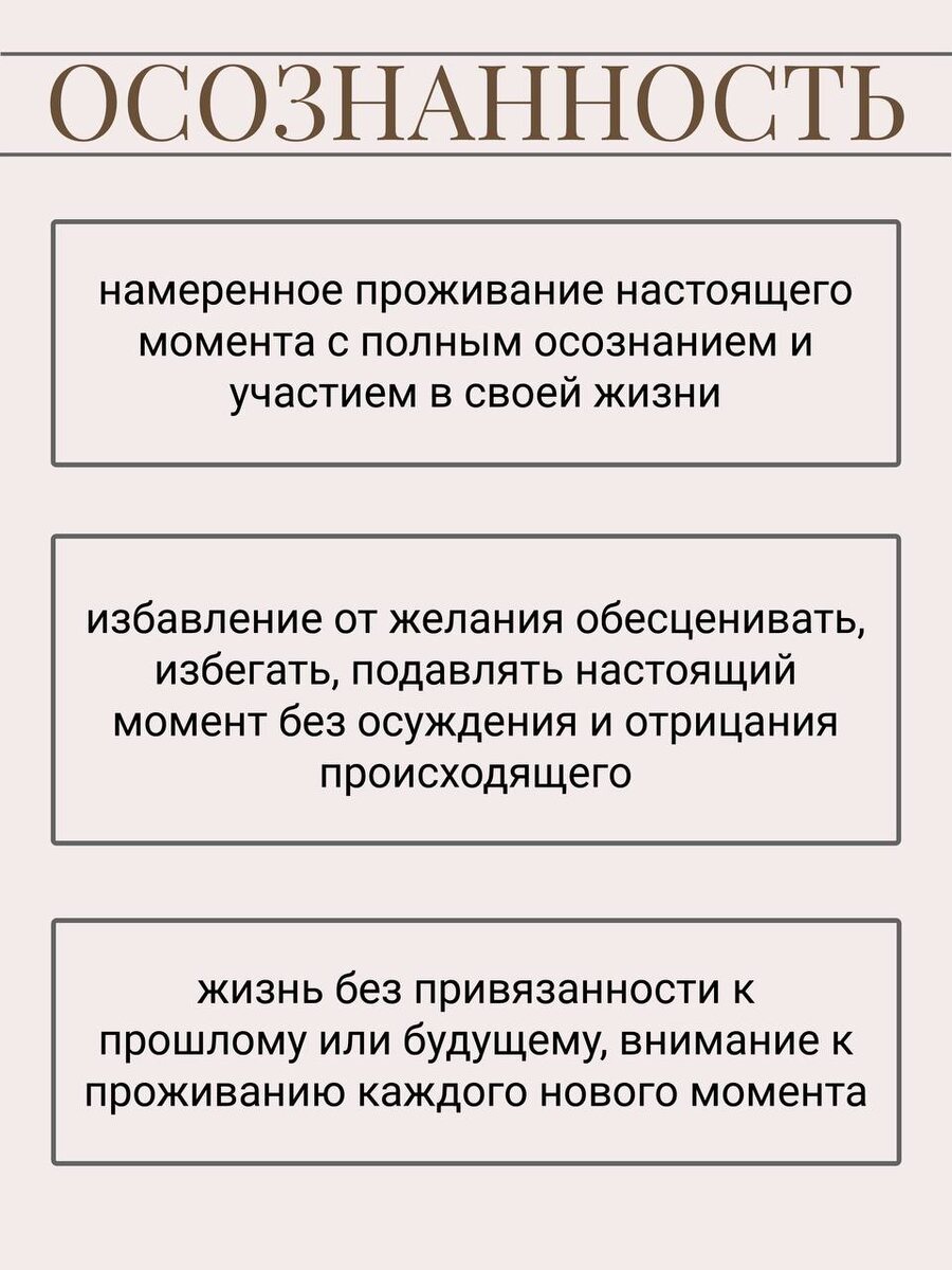 Многочисленные исследования показывают, что ежедневная практика осознанности позволяет более полно присутствовать в жизни, улучшает ее качество. Укрепляет отношения с другими людьми. Осознанность помогает отказаться от автоматических и дисфункциональных эмоций и поведения. Осознанность можно практиковать занимаясь любым делом, в любом месте, в удобное время. Можно осознанно заниматься спортом или домашними делами. Осознанно танцевать или осознанно общаться. Главное - уделять внимание проживанию настоящего момента без оценки и критики. Принимая происходящее как факт. В эти моменты мы способны делать сознательный выбор и не застревать в боли и страдании. Осознанность - это здоровый способ познания, основанный на реальном опыте. Группа в Телеграм @kitaevaelen1