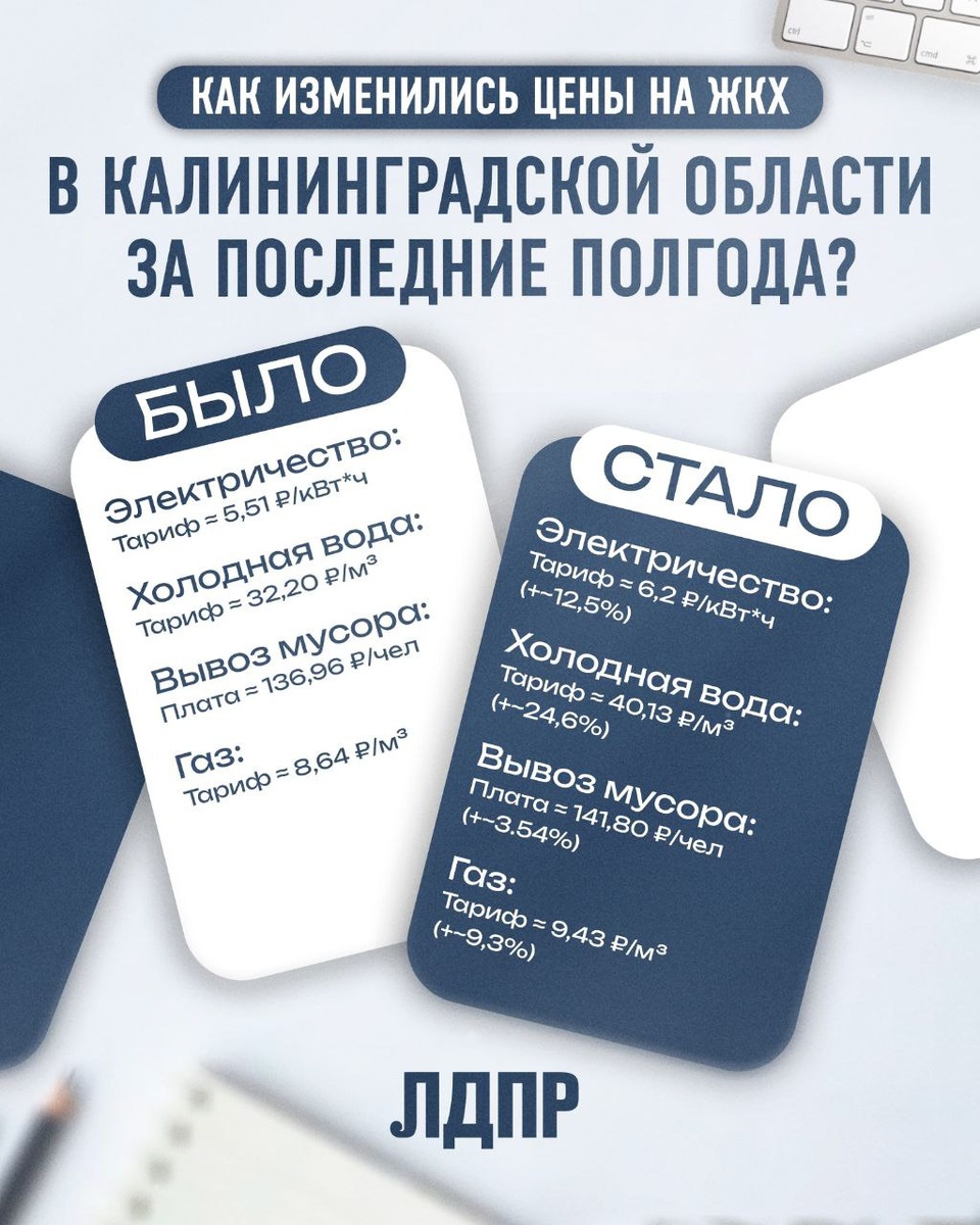 В Калининграде растут цены на услуги ЖКХ! Жители Калининграда столкнулись с очередным повышением тарифов на коммунальные услуги. ЛДПР выражает обеспокоенность ростом цен, который бьёт по карману каждого горожанина. Вот актуальная статистика: Электричество: было 5,51 руб./кВт·ч, стало 6,20 руб./кВт·ч (+12,5%); Холодная вода: было 32,20 руб./м³, стало 40,13 руб./м³ (+24,6%); Вывоз мусора: было 136,96 руб./чел., стало 141,80 руб./чел. (+3,54%); Газ: было 8,64 руб./м³, стало 9,43 руб./м³ (+9,3%). ❕ЛДПР считает недопустимым такой рост цен без соответствующего повышения качества услуг и уровня жизни населения. Мы требуем от властей прозрачного обоснования повышения тарифов и мер поддержки для жителей, особенно для малообеспеченных семей. Координаторы ЛДПР в Калининграде ежедневно принимают обращения граждан по вопросам ЖКХ. Мы будем добиваться справедливости и качественного предоставления коммунальных услуг!