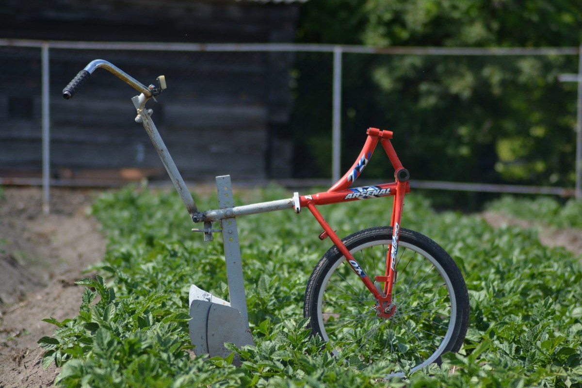 И счастливым будешь. Начинать нужно с плуга. Делаем плуг, если есть можно использовать или приобрести в специальном магазине. Лопасти рекомендую делать большие, чтобы землю раскидывало при проходе между рядков. Все можно вырезать болгарочкой. Не забываем при работе с болгаркой, использовать очки для защиты глаз. Свариваем детали вместе, чтобы получился плуг. Далее необходимо придумать колесо для точки опоры. Мы использовали старый велосипед. На предыдущей картинке можно увидеть примерный развал пластин, это 35-40см. Берем старый велосипед и отрезаем у него все