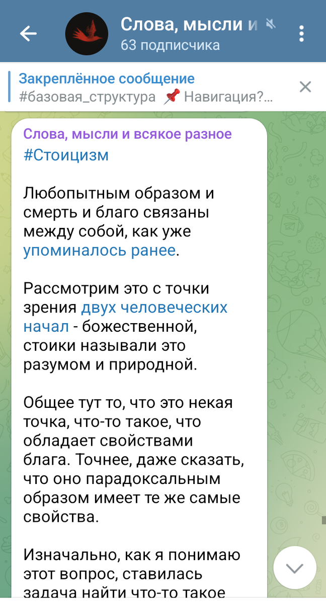 Здравствуйте, наши уважаемые читатели. Наша подборка по стоицизму пополнилась еще одним крайне любопытным текстом ученика финансового курса. Итак, давайте почитаем. ************* "Любопытным образом смерть и благо связаны между собой, как уже упоминалось ранее. Рассмотрим это с точки зрения двух человеческих начал: божественной (стоики называли это разумом) и природной. Общее тут то, что это некая точка, что-то такое, что обладает свойствами блага. Точнее, даже сказать, что оно парадоксальным образом имеет те же самые свойства. Изначально, как я понимаю этот вопрос, ставилась задача найти что-то такое неподвижное и неделимое. Нечто такое, что может служить точкой отсчета, мерилом всего остального. Это будто гирька у торговца, благодаря которой он может взвешивать все остальные товары, приводя вес товара к степени сходства с весом гирьки. Но как измерить нематериальное? Задача настолько нетривиальная, что, по сути своей, не решена до сих пор. Мы же рассмотрим дискурс стоиков
