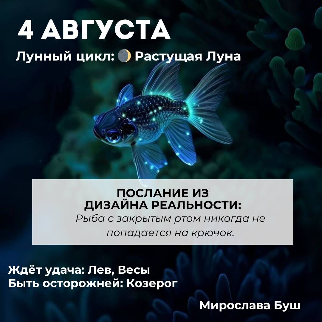 4 августа РЕКОМЕНДАЦИИ: 🧹 День требует легкости — и физической, и ментальной. Чем меньше хлама под ногами, тем быстрее приходит ясность в голову. Пропылесосьте даже там, где обычно «и так сойдет». 👗 Наденьте что-нибудь яркое — или хотя бы вытащите с полки любимую вещь. Луна в Стрельце любит, когда мы выражаем себя смело. Даже если это просто зеленые серьги в понедельник. ✉️ Подписаться на Мирославу #прогнознадень