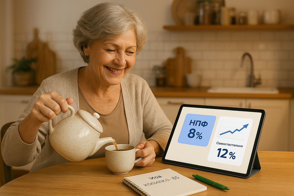Готова раз в месяц уделять час портфелю → инвестирую сама. Никогда не вкладываем последнюю «подушку». НПФ блокирует деньги до пенсии, а брокерский счёт подвержен колебаниям. Хотите прибавку 20 000 ₽ к пенсии? При доходности 8 % и горизонте 10 лет нужно откладывать ~7 000 ₽ в месяц в НПФ. При самостоятельной доходности 12 % хватит 5 000 ₽, но риски выше. Главное — начать: чем раньше положите первый рубль в «копилку-