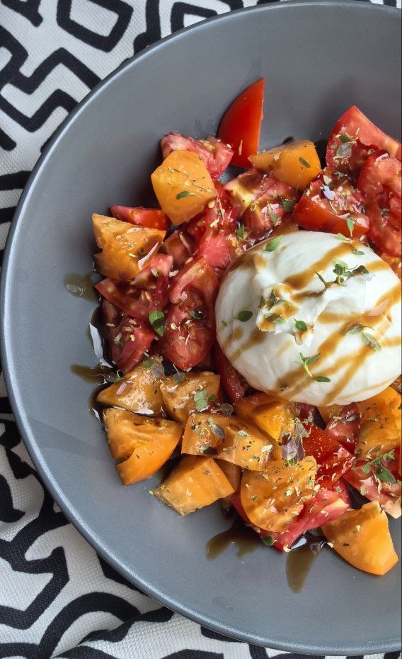 Буррата с помидорами — просто, но божественно. Почему этот салат обожают даже шеф-мишлен? Что за зверь — буррата? Представьте моцареллу, но с сюрпризом — внутри у неё кремовая, почти текучая «начинка» из сливок и сырных нитей. Родом из Апулии (юг Италии), где её до сих пор делают вручную, заворачивая в листья асфоделины — чтобы дышала. Чем отличается от моцареллы? Текстура. Снаружи плотная, внутри — нежный крем, который вытекает при разрезе. Вкус. Богаче, сливочнее, с лёгкой кислинкой. Подача. Только свежей (хранится 1-2 дня) и обязательно комнатной температуры — иначе не раскроется. Салат с бурратой и помидорами по-каприйски (Тот самый, что подают на террасах с видом на Средиземное море. Готовится за 10 минут, а впечатляет — на 100%.) Ингредиенты на 2 порции: Буррата — 1 шт. (125-150 г) Помидоры (черри или «бычье сердце») — 300 г Базилик — горсть Оливковое масло extra virgin — 3 ст.л. Бальзамический крем — 1 ч.л. Соль морская + свежемолотый чёрный перец — по вкусу Чеснок — 1 зубчик (о