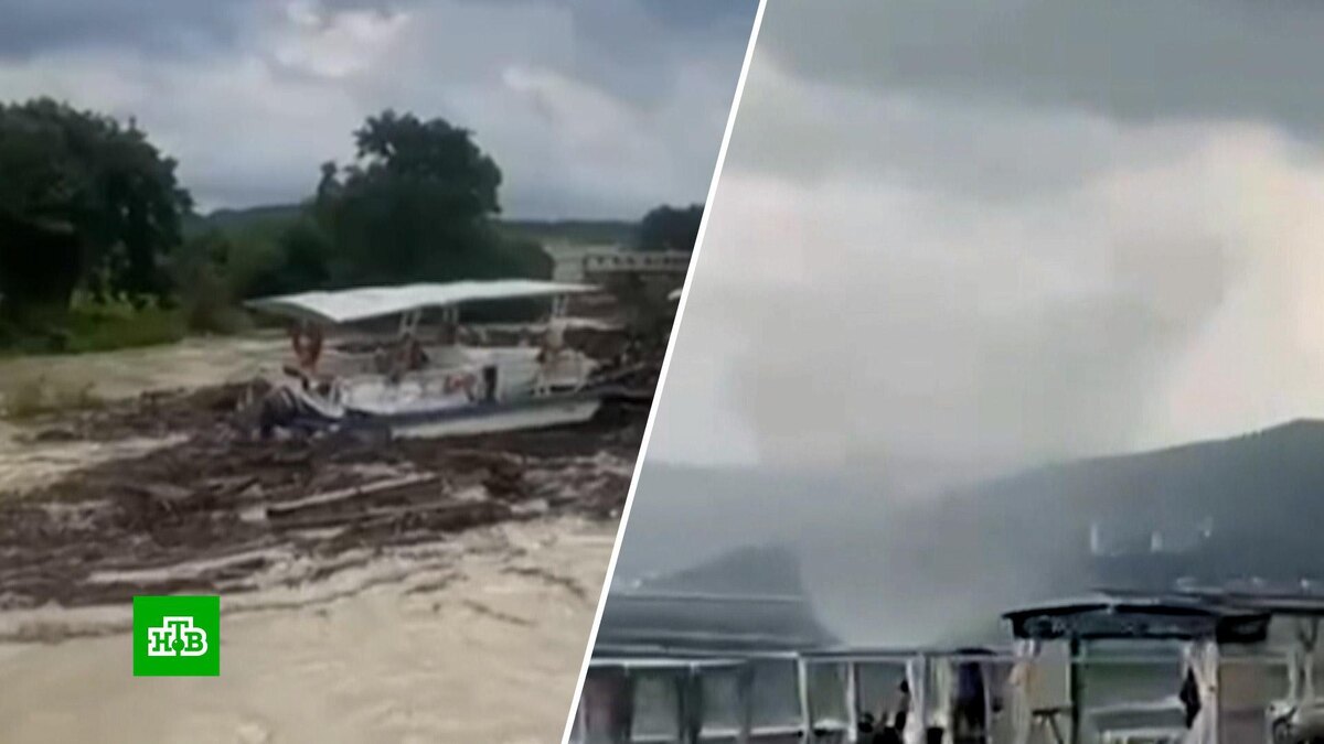 [ Смотреть видео на сайте НТВ ] На главный курортный регион России — Краснодарский край — сегодня обрушились проливные дожди с градом и штормовым ветром. Началось наводнение, в некоторых районах сошел сель. В центре удара стихии оказался Туапсинский район, в котором ввели режим ЧС. В Туапсинском районе реки после мощных дождей вышли из берегов — затапливало улицы и дороги. В селе Лермонтово потоками воды снесло мост. В поселке Агой на берег вышел смерч, сильно напугав отдыхающих. В станице Дефановка водой смыло автобус. Спасатели эвакуировали на лодке 25 пассажиров. По словам местных жителей, сильный дождь шел с 4 часов утра, а в 9 вода уже зашла в дома. Карен со всеми родственниками отмывают дом. Говорит, что вода зашла сантиметров на 20, но этого вполне хватило: мебель, ламинат, кухня, кровати — всё на выброс. Сейчас в пострадавших поселках организованы пункты временного размещения. По данным синоптиков и спасателей, непогода продолжит бушевать на побережье минимум до завтрашнего веч