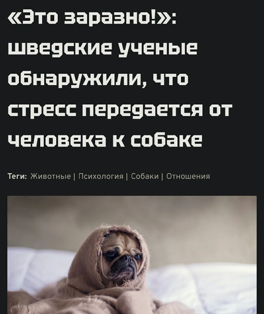 Стресс передаётся от человека к СОБАКАМ — учёные подтвердили. Что показало исследование шведов: ⚡️Чем крепче связь между владельцем и питомцем, тем сильнее они «синхронизируют» стресс. ⚡️Собаки зеркалят эмоции хозяина и начинают проявлять признаки тревожности. ⚡️Реагируют на общие триггеры — громкие звуки, конфликты, резкие перемены в рутине. ⚡️Повышенное дыхание, учащённый пульс и изменения в поведении у собак могут быть прямым отражением состояния владельца. ⚡️Порода не имеет значения — решающим фактором остаётся близость отношений с человеком. Передай собачникам. CtrlAltDelights- подписаться