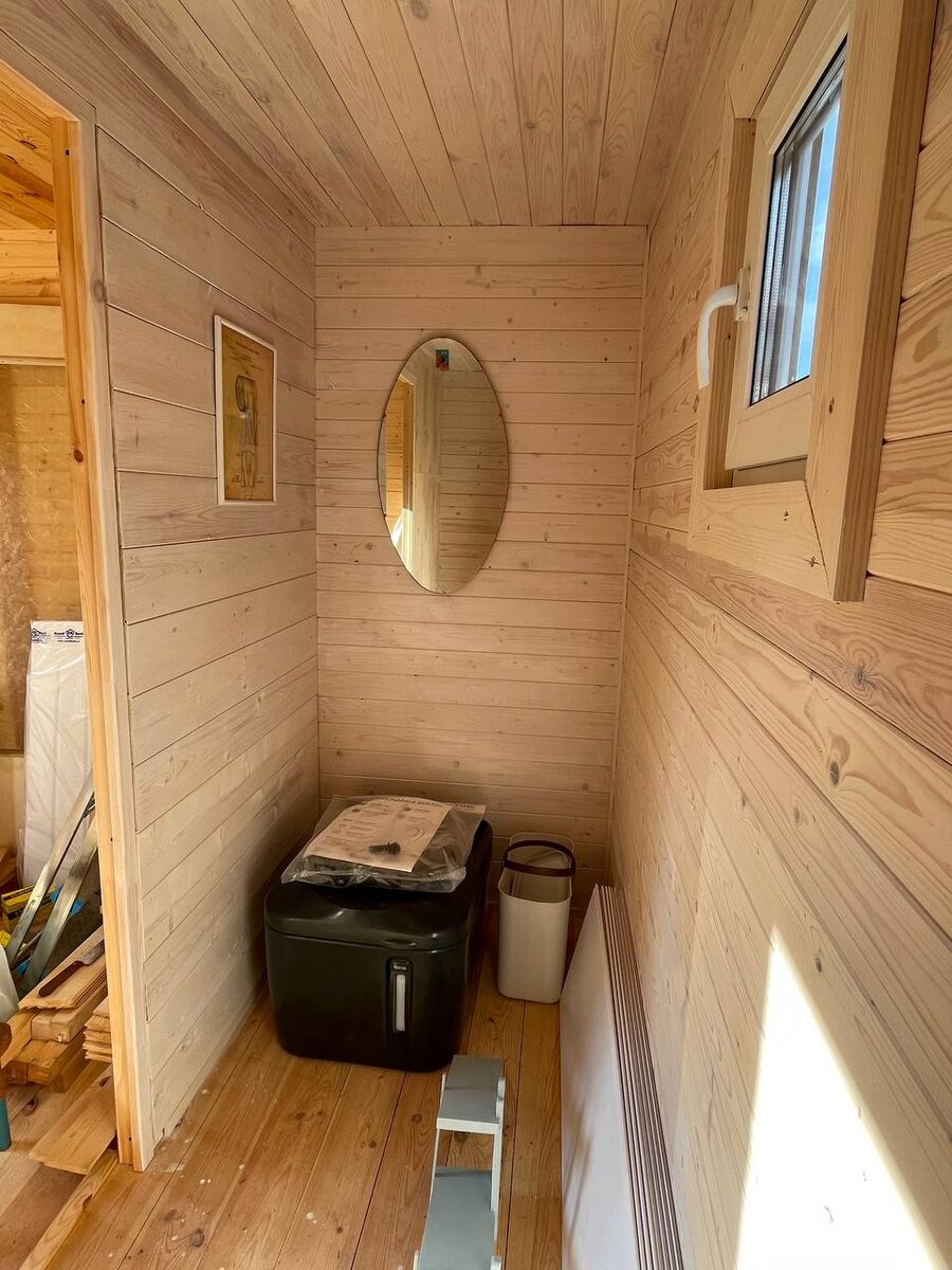 После почти двух недель отсутствия на даче поработали в легком режиме. Я покосила немного травы, мама подергала сорняки из грядок и клумб, а еще обработала выбеливающей пропиткой зону санузла в новом домике. Пропитка закончилась в самый неподходящий момент, не хватило на стенку с окном. На радостях сразу подвесили зеркало и картинку. А потом я нарезала панели для душевой зоны (будем еще по месту подрезать) и поняла, что силикон, которым я хотела обрабатывать стыки, я забыла, так что приклеивание откладывается на недельку. Чтобы сильно не расстраиваться, покрасила полочку для всяких туалетных принадлежностей. Ее делал еще мой дедушка лет 50 назад, когда-то на ней стояли цветы, потом она долго висела в роли косметической полки под зеркалом. А теперь пришло ее время проживать новую жизнь🙂 В оставшееся время продолжали потихоньку наводить порядок, выкидывать ненужное, приделали пару полок в чулане. И успела даже покрыть маслом свой душевой поддон и одну из лестниц к домику. В общем, в эти