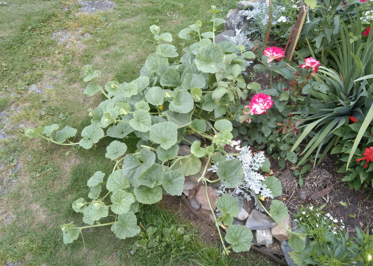 И всё таки это дыня, появились первые завязи в Августе, для Сибири это поздно. И что теперь с ней делать, незнаю. Сделала причёску, где есть завязь, оставила побег и прищипнула. А вдруг что то и успеет вырасти, погода не предсказуемая. Может осень тёплая будет, хотя надежд мало. Всё в полюбившийся дымокур. То комары, то мошки, а он здорово помогает. В планах сделать что то вроде очага на ножках. Чтобы это смотрелось более интересно и гармонично, на фоне цветов. Идея пришла во время изготовления кашпо из сеток😊 Ой, кто бы ещё до ума эти кашпо доделал🤦😁 пока сделала так сказать, тяп ляп) Куча нарезанной сетки, руки все расцарапаны, вся в брызгах чёрной краски, но сделала🤗 главное петунии посадила, чтобы успели хоть немного разрастись до холодов. Лишнее хоть убрала, теперь цветам мешать не будут и розе Юбилей Принца Монако. Да и ходить вокруг, запинаться об плети неохота☺️ Роза Августа Луиза, наконец то доцветает первая волна, долго цвета, думала не дождусь, когда обрежу отцв