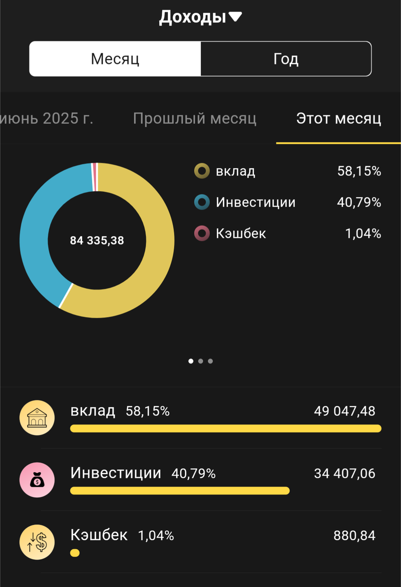 Друзья, спешу поделиться отличными новостями! Мой пассивный доход в июле превысил 84 тысячи рублей — точнее, 84 335,38 руб. 🚀 Основной доход принесли, как обычно, вклады. Скоро закончится лафа. Ключевая ставка уже снижена до 18%, а банки снижают ставки по вкладам стремительно! В августе закончатся два вклада, и новые открывать придется уже со сниженной ставкой. (Проценты направлю на фондовый рынок!) Облигации делают свое дело — купоны поступают, портфель растет, тем самым увеличивая размер ежемесячного дохода. Но также было немного дивидендов. Основные выплаты дивидендов придутся на август, который обещает быть рекордным по пассивному доходу за все время моего инвестирования. Напомню, что рекорд сейчас принадлежит июню 2025 г. — 107 094,00 руб. 🏆 Кэшбек добавляю в данный пост просто по кайфу. Сэкономил — значит, заработал. Многие говорят, что нет средств для инвестирования, но вот же они — пусть не много, но все же можно засунуть в фонд денежного рынка. Я так и сделаю, направляя их в