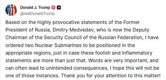 В ответ на пост Трамп отправил две атомные подводные лодки в "соответствующие районы" из-за высказываний Медведева "В связи с крайне провокационными заявлениями бывшего президента России Медведева, ныне заместителя председателя СБ РФ, я отдал приказ разместить две атомные подводные лодки в соответствующих районах на случай, если эти глупые и провокационные заявления окажутся чем-то большим", — заявил президент США. Медведев в ходе своей перепалки с Трампом напомнил президенту США о наличии у России системы "Мертвая рука". Куда отправились американские подлодки и их тип, Трамп не раскрыл.
