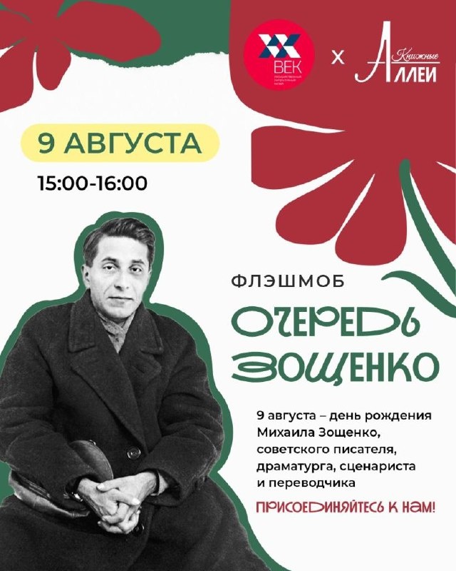 9 августа Литературный музей «ХХ век» отметит 131-летие со дня рождения Михаила Зощенко. Праздничные мероприятия пройдут во дворе Писательского дома, где жил Михаил Михайлович, в его мемориальной квартире, а также на Малой Конюшенной улице в рамках фестиваля «Книжные аллеи».