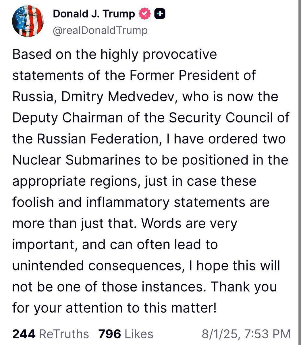 Трамп сообщил, что распорядился направить две атомные подлодки «в соответствующие регионы» из-за заявлений Дмитрия Медведева. «На фоне крайне провокационных высказываний бывшего президента России, а ныне зампреда Совбеза РФ, я приказал разместить две атомные субмарины на случай, если эти безрассудные слова не останутся просто словами», — написал Трамп в своей соцсети Truth Social. Ранее у Трампа с Медведевым случился баттл в соцсетях. 28 июля Дмитрий Медведев сначала предостерёг в соцсети американского лидера от ультиматумов, назвав их шагом к войне. А спустя несколько дней, 31 июля, в ответ на критику Трампа в адрес России, он посоветовал тому вспомнить о "ходячих мертвецах" и "мертвой руке". "Мертвой рукой" на Западе называют советскую систему "Периметр", которая была создана для гарантированного ответного ядерного удара в случае агрессии, даже если высшее руководство страны будет уничтожено.