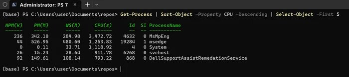 > Get-Process | Sort-Object -Property CPU -Descending | Select-Object -First 5