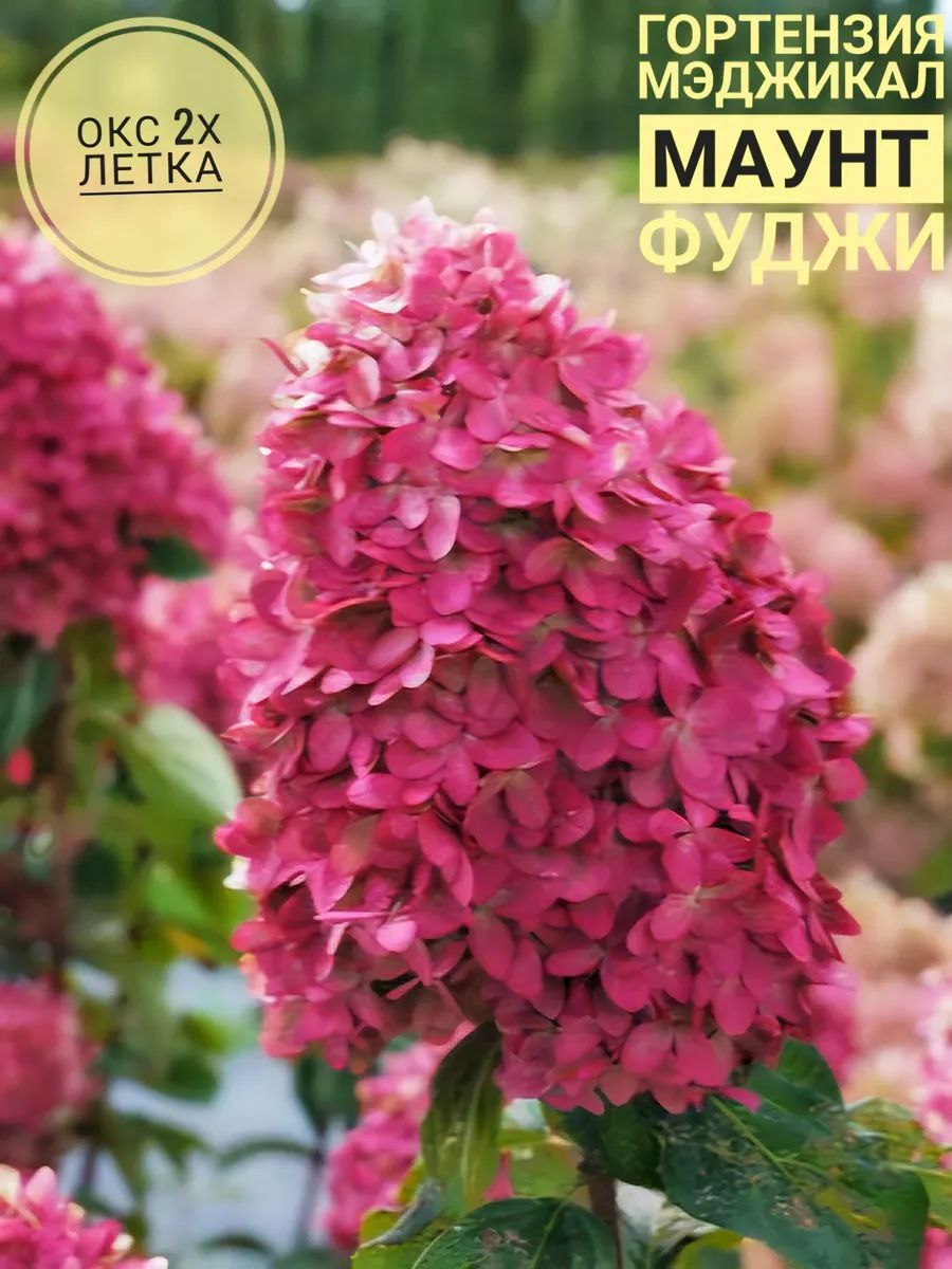 Описание сорта Гортензия метельчатая Мэджикал Маунт Фуджи Куст с прочными вертикальными побегами формирует удивительно крупные и плотные соцветия. В течение 90 дней их окрас меняется с лайма на сливочные тона и далее, через пенную белоснежность, наступает розово-красный апофеоз цветения. Осенью на вашем участке можно будет наблюдать трепещущее малиновое пламя. Сорт неприхотливый, любит полив, но без застоя воды. Зимостойкость до −34 °С.