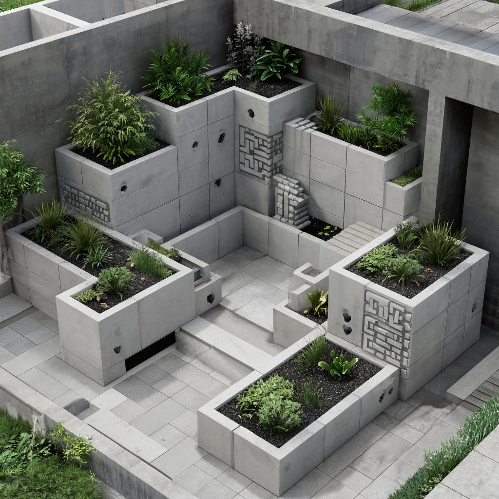 Внешний вид бетонных блоков изначально утилитарен. Однако это не приговор эстетике огорода. Бетонные грядки открывают широкий простор для декорирования. Самый простой способ – покрасить наружные стенки блоков. Для этого используют фасадные краски по бетону, устойчивые к атмосферным воздействиям. Цвет может быть любым: от спокойных зеленых и коричневых оттенков, сливающихся с ландшафтом, до ярких, акцентных тонов. Блоки с фактурной поверхностью или имитирующие камень смотрятся интереснее гладких. В полости блоков можно высадить низкорослые, почвопокровные или ампельные растения. Идеально подходят различные виды очитков (седумов), камнеломки, алиссум, лобелии, настурции. Их корни укрепятся в почве внутри блока, а зелень и цветы эффектно обрамят грядку, смягчая строгость бетонных линий. Такое озеленение создает дополнительный микроклимат и привлекает полезных насекомых. Комбинируя блоки разных типов (например, стандартные и угловые) или используя блоки с декоративной поверхностью, можно создавать грядки, которые сами по себе становятся элементом ландшафтного дизайна.