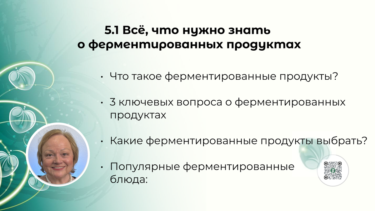 Это натуральные продукты, содержащие полезные живые бактерии. Они: - Улучшают состав микробиома кишечника - Создают неблагоприятную среду для патогенных бактерий - Снижают воспаление - Укрепляют иммунную систему Ферментированные продукты — отличный источник пробиотиков, которые нормализуют микробный баланс в пищеварительной системе. Важно: Их можно использовать только после снижения активности патогенной микрофлоры и устранения симптомов СИБР/СИГР. Поэтому в нашей программе мы временно исключаем их на этапе уничтожения грибов и патогенной микрофлоры, но затем обязательно вводим на постоянной основе. 3 ключевых вопроса о ферментированных продуктах: 1. Почему именно ферментированные продукты, а не суперфуды или свежие овощи? Ферментированные продукты и напитки содержат широкий спектр полезных бактерий, которые напрямую влияют на: - Настроение - Уровень энергии - Внешний вид - Ощущение счастья 2. Почему нельзя просто купить пробиотики в аптеке? - В аптеках сложно найти по-настоящему качес