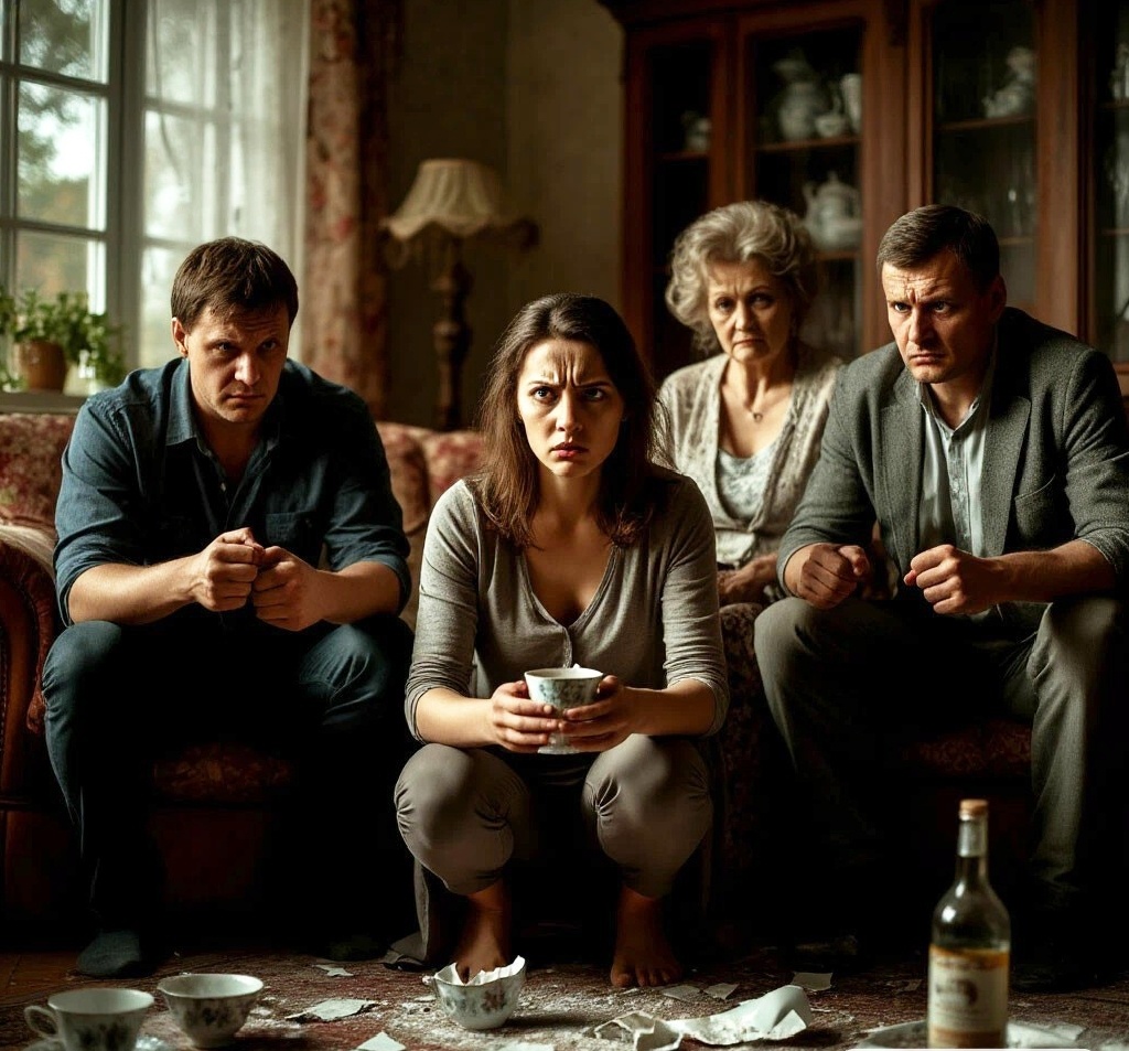 Анна вскочила, и в этот момент её локоть задел чашку — та самая, "дорогая фарфоровая", подарок свекрови. Она разбилась с чистым, звонким звуком.