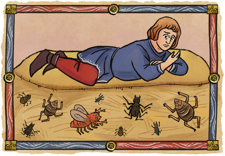 Мешки, набитые соломой и камышом, заменяли матрасы. Мягко? Скорее жёстко, колко и опасно. Солома не менялась месяцами, а то и годами. В ней поселились те, кто никогда не платил за аренду — вши, клопы, блохи. Особенно опасны были крысиные блохи, главные переносчики бубонной чумы.