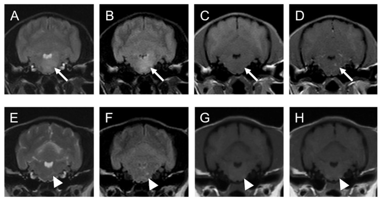 Кейс 1. Собака, 3 года, генерализованная лимфома ЦНС. Пациент – той-пудель с остро возникшим синдромом вестибулярного поражения и глубокими расстройствами проприоцепцииpmc.ncbi.nlm.nih.gov. На МРТ выявлены множественные очаги: в левом таламусе и в продолговатом мозге – оба гиперинтенсивны на T2/FLAIR и слегка накапливают контрастpmc.ncbi.nlm.nih.gov. Также отмечается диффузное усиление мягких мозговых оболочек над этими областями. ЦСЖ-аналіз показал повышенный клеточный состав с моноцлональными В-лимфоцитамиpmc.ncbi.nlm.nih.gov. Диагноз – PCNSL, В-клеточный. Назначена химиотерапия (нимустин + преднизолон). Через 8 месяцев контрольная МРТ: все прежние очаги полностью исчезли, остались лишь точечные зоны глиоза без контрастированияpmc.ncbi.nlm.nih.govpmc.ncbi.nlm.nih.gov. Клинически – полная ремиссия, которая сохраняется свыше 2 лет (данные на момент публикации)pmc.ncbi.nlm.nih.gov.