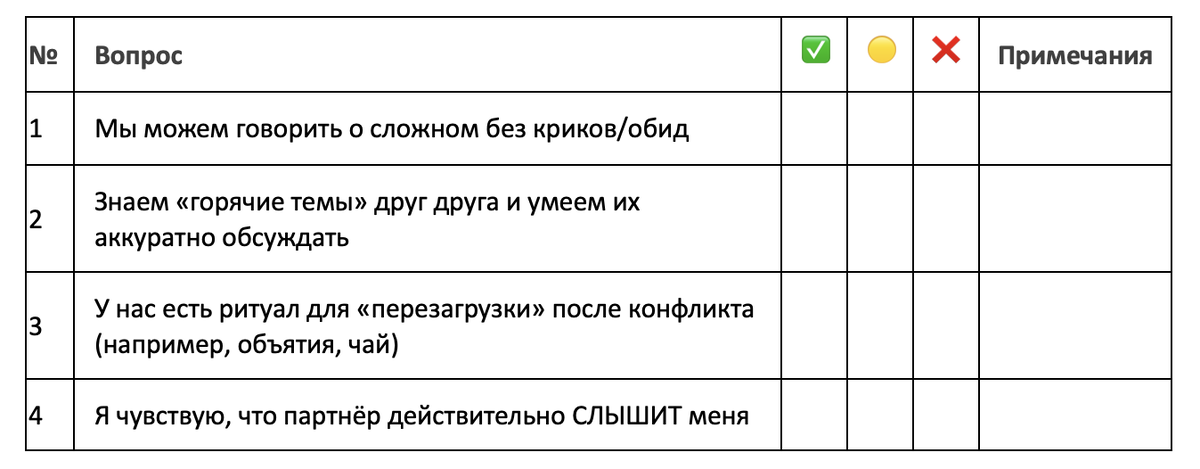 Вы уже много лет вместе, но есть вопросы - у нас все хорошо? или нужно что-то срочно делать? все ли у нас в порядке? правильно ли мы движемся? нужно ли нам что-то менять? а вдруг я просто не замечаю, вон у тех одно, у этих - другое! Если у вас стали возникать подобные вопросы, то специально по этому поводу я подготовила чек-лист. Пользуйтесь, если возникнут вопросы, задавайте! 🔸 18-20 ✅ – Ваши отношения в отличной форме! 🔸 12-17 ✅ – Есть зоны для роста, но основа крепкая 🔸 Менее 12 ✅ – Пора уделить отношениям больше внимания и отправиться к специалисту P.S. Хотите персонализированную версию под вашу пару? Отправьте ваши "болевые точки", я подготовлю персональный чек-лист! 💌 Подписывайтесь на мой Яндекс канал https://dzen.ru/psiholog-adekvatolog.ru?share_to=link И ставьте лайки👍, пишите комментарии 👍 сейчас это очень важно, как никогда Если вы вместе около 1 года, то чек-лист для вас здесь Если вы вместе около 3 лет, то чек-лист здесь #психология #женскаяпсихология #ликбе