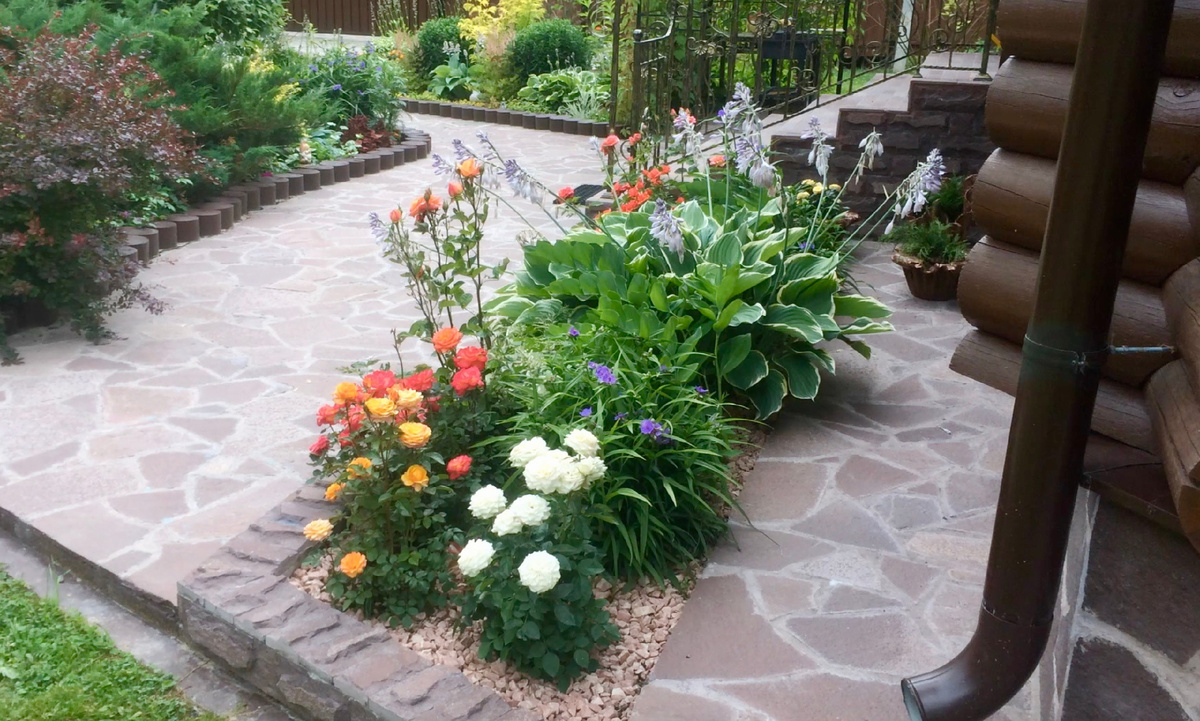 Не менее важен также фон, чтобы растения более выигрышно смотрелись на фоне фасада дома или цоколя с отмосткой. Мульчирующий материал, если токовой предусматривается, и бордюр также должны гармонировать с растениями и отмосткой.